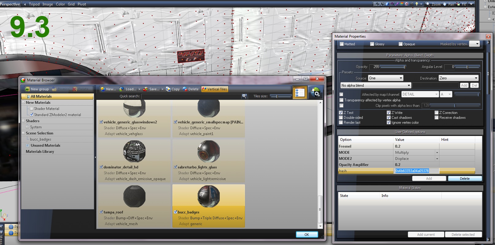 При переделывании материала стекол во вкладке User-defined options можно внести свойство Hash от оригинального материала для стекол. Важно: в игре допускается только один материал с каждым уникальным значением Hash — нельзя пользоваться одним и тем же значением Hash на разных материалах. Про невозможность замены текстуры на материале GPLC («фары») уже было сказано выше. (рис.9.3).