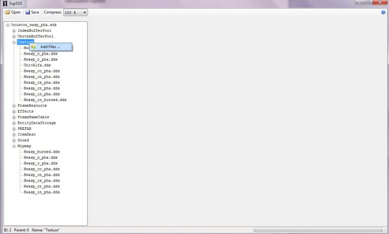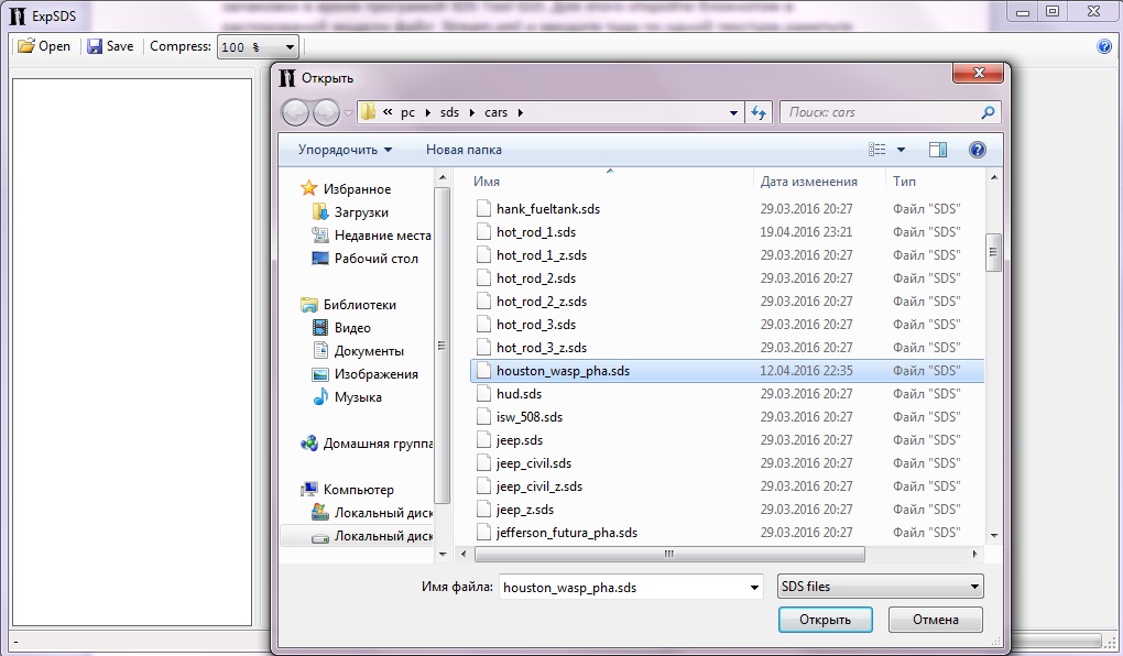 ВАЖНО Если хотите, чтобы материал с текстурой фары оставался нетронутым, к нему также можно применить шейдер Vehicle — generic, в этом случае он будет разбиваться, но не будет светиться текстурой, будет только flare-эффект. Теперь вам нужно зарегистрировать материалы от вашей модели в общей базе игры default.mtl (mafia 2\edit\materials\). Материалы вашей модели прописываются на экспорте в файл (название автомобиля).mtl в папке экспорта. Если вы использовали оригинальные материалы (сохраняли значение Hash и лишь меняли текстуры), то не будет лишним найти эти оригинальные материалы и поменять названия родных текстур, на свои. В этом случае допускается оставлять оригинальный материал. Таким образом, у вас будут зарегистрированы новые/измененные материалы от вашей модели, если же этого не сделать, то текстуры модели будут ярко зелеными. Урок по запаковке новых текстур в архив автомобиля. В окне программы ExpSDS нажмите «Open» и выберите sds архив заменяемого автомобиля (рис ниже).