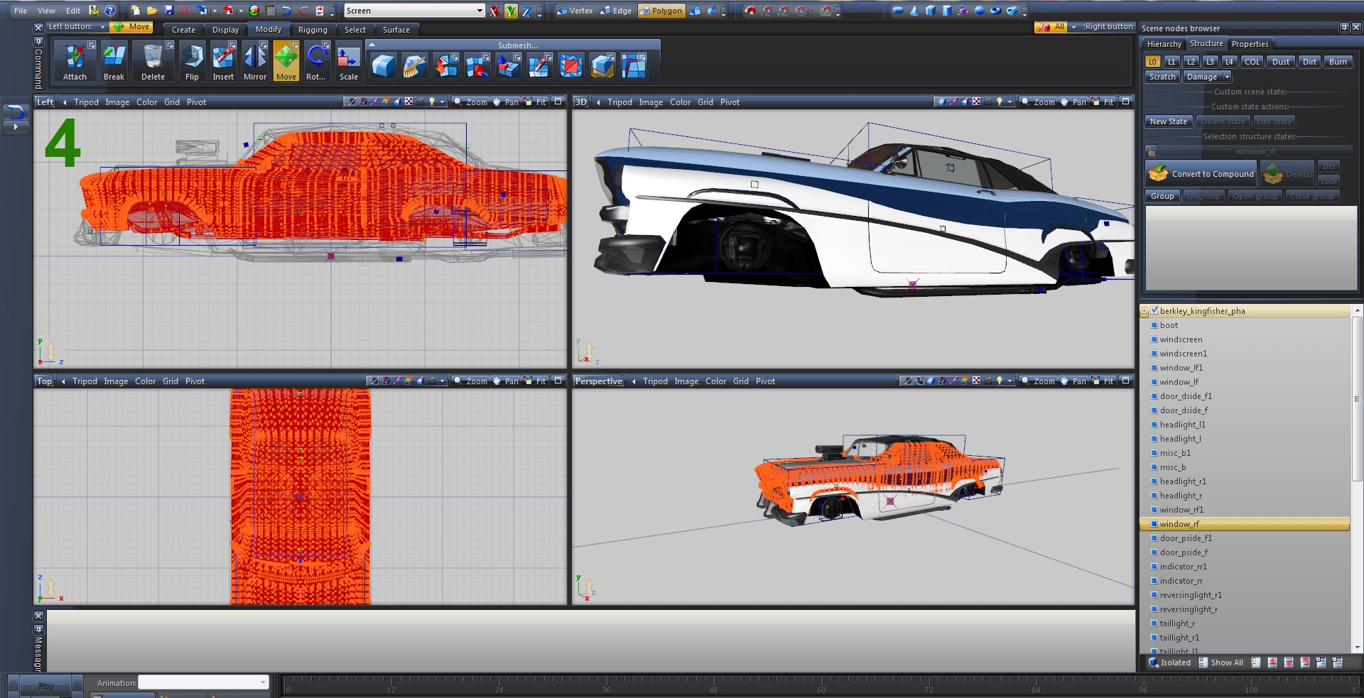 В иерархии модели есть несколько веток, одна из них начинается с имени, содержащим в окончании _rain — эта ветка содержит объект для отрисовки брызг и капель дождя на поверхности кузова. Еще одна ветка содержит объект причудливой формы внутри (скорее всего, используется для эффекта огня при сгорании авто) и, собственно, ветка иерархии авто. Перед экспортом необходимо перетащить ветку, соответствующую автомобилю, выше остальных, чтоб она была первой (рис. ниже).
