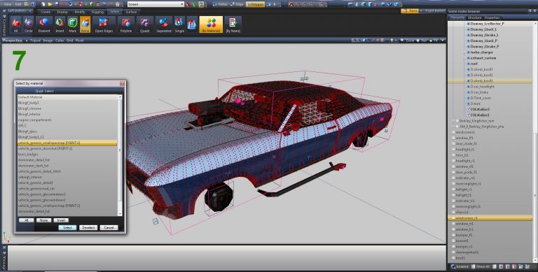 Дополнительные объекты иерархии, которые присутствуют в оригинальной модели сохраняйте без изменений, перемещать или даже удалять ни в коем случае нельзя, такие объекты как _deform, за исключением случая, когда _deform это кусок какой-то части авто. В остальных случаях, когда_deform это квадраты, перемещать нельзя, это приведет к повреждениям машины. Применение материалов к конвертируемой модели. Полностью выделите вашу модель и перейдите в режим полигонов (рис.7).